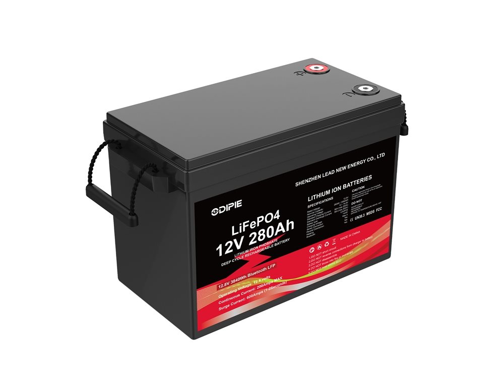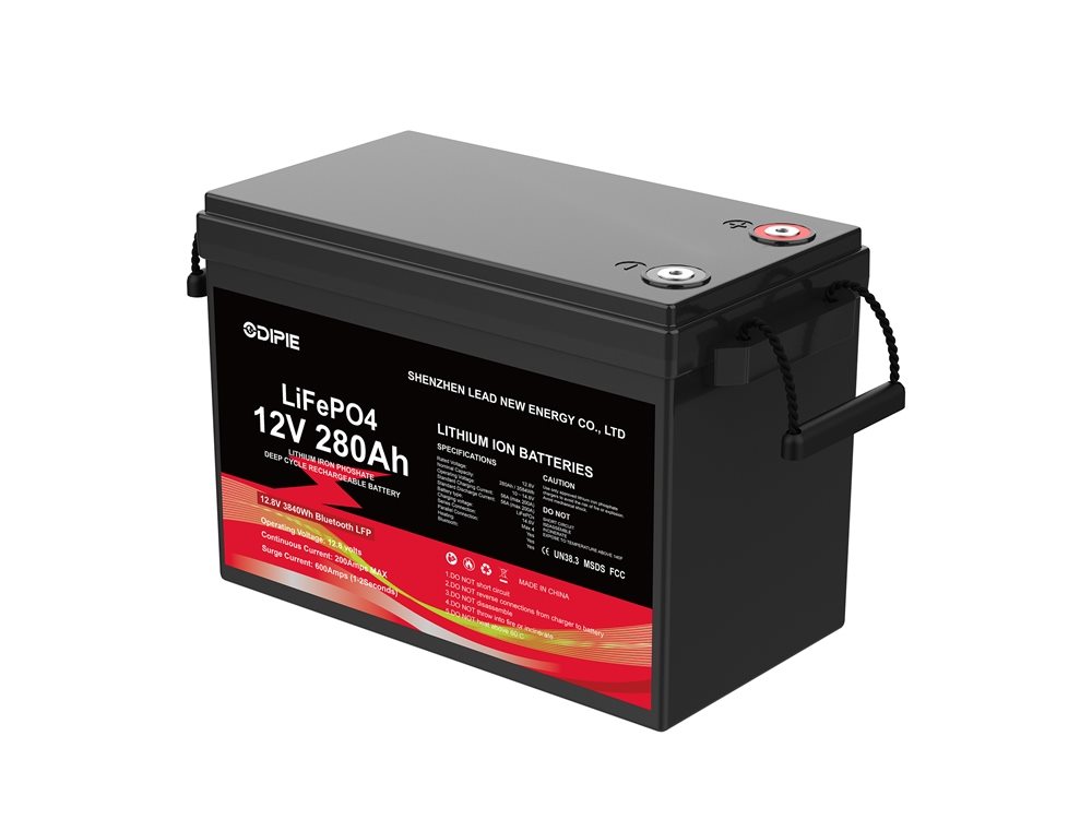 Odipie 12.8 V 280 Ah heated LiFePO4 battery: 6 000 cycles, 200 A BMS, IP65, Bluetooth, –20 °C charge, 4S4P expand. Ideal marine, solar storage.