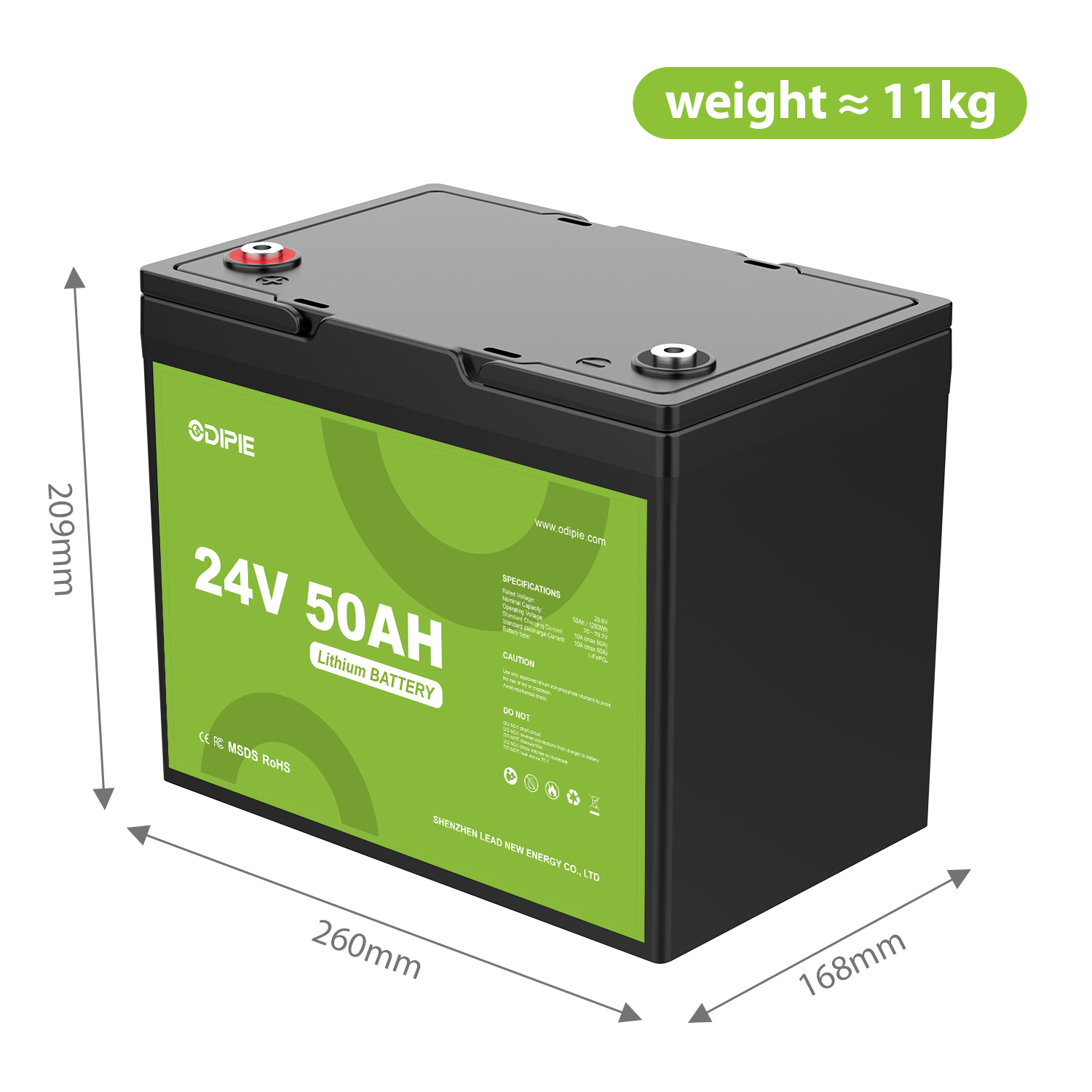 Odipie 24V 50Ah LiFePO4 battery delivers 1.28kWh, 50A continuous, IP65, 2000 cycles. Smart BMS, LCD/Bluetooth, 2h fast charge.