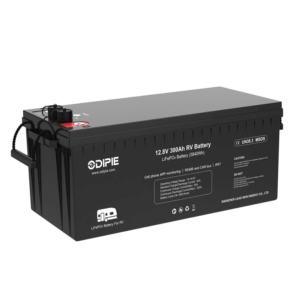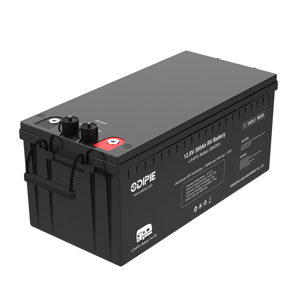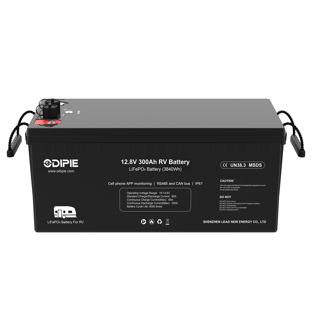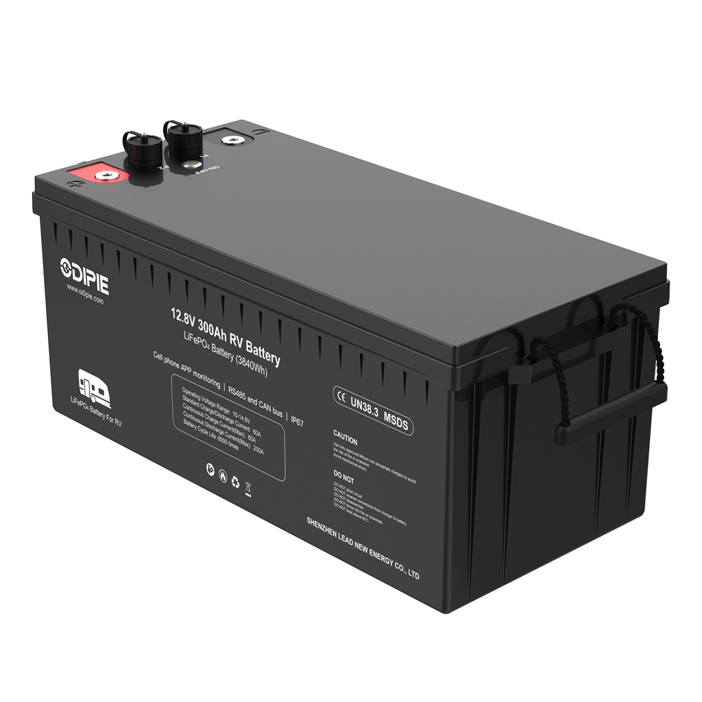 Odipie 12V 300Ah heated LiFePO4 deep-cycle battery: 200A BMS, 4S4P 48V/1.2kAh, –20°C charge, 6000 cycles, IP67. Dealer bulk, white-label.
