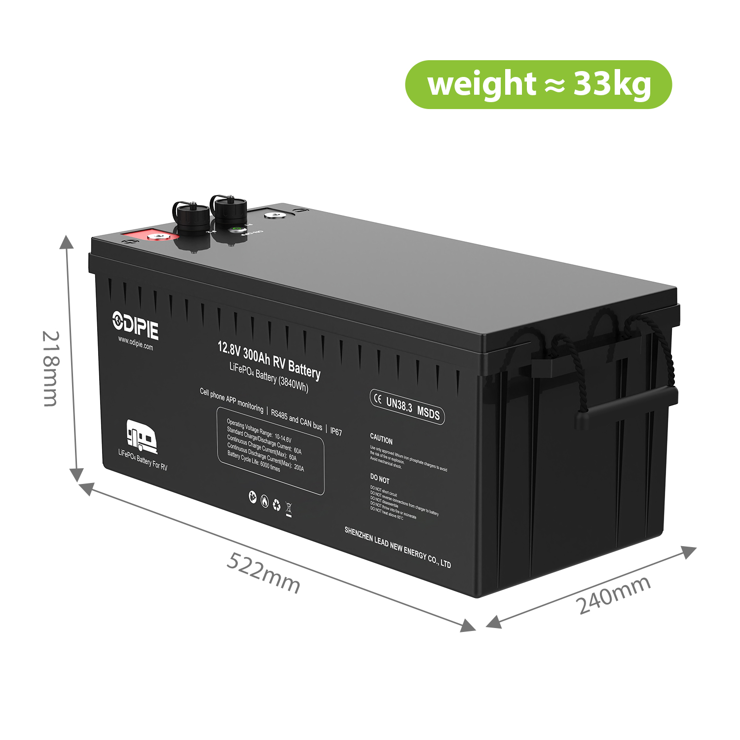 Odipie 12V 300Ah LiFePO4 battery—Shenzhen-made, EU/US stock—packs A grade cells, 200A Smart BMS with Bluetooth, 4000 cycles, IP67, optional heater, support 4S or 4P connection. lighter and smaller than AGM; perfect for RV, marine, off-grid solar. Deep-cycle only, no cranking.