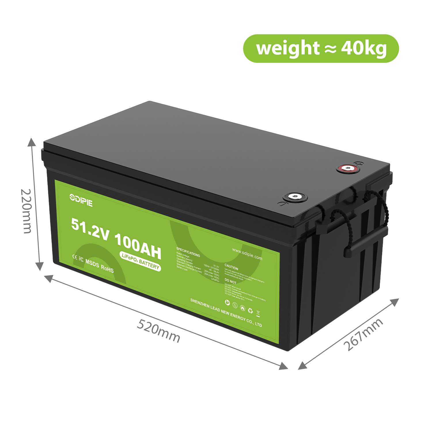 Odipie 51.2V 100Ah Powerwall LiFePO4 battery packs 5.12kWh, 5000 cycles, 100A BMS, IP65 ABS case; Ideal for solar self-consumption, telecom, mobile business.