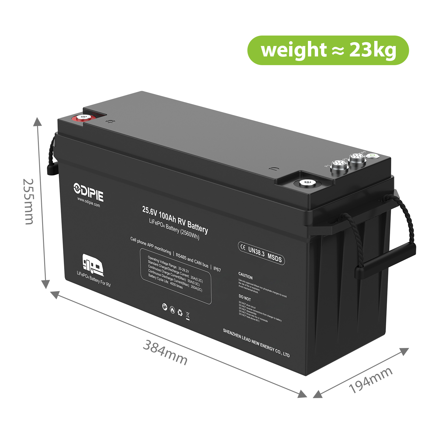 Energy Density: 25.6V 100Ah Odipie LiFePO4 battery delivers 2560 Wh from only 22kg—smaller footprint than two 12V 100Ah in series, cutting freight & install cost.