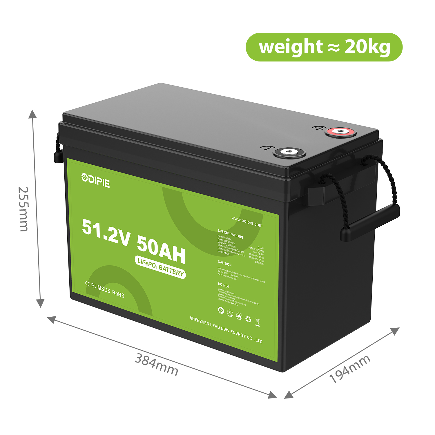 Odipie 51.2V 50Ah Lightweight LiFePO4 battery — 2.56kWh, 50A BMS, 3000 cycles, 20kg.solar/58.4 V charger ready. Ideal home ESS, telecom. UN38.3/CE, bulk OEM from Shenzhen.