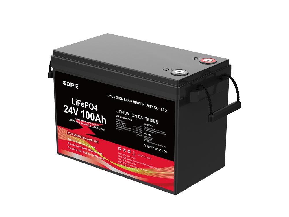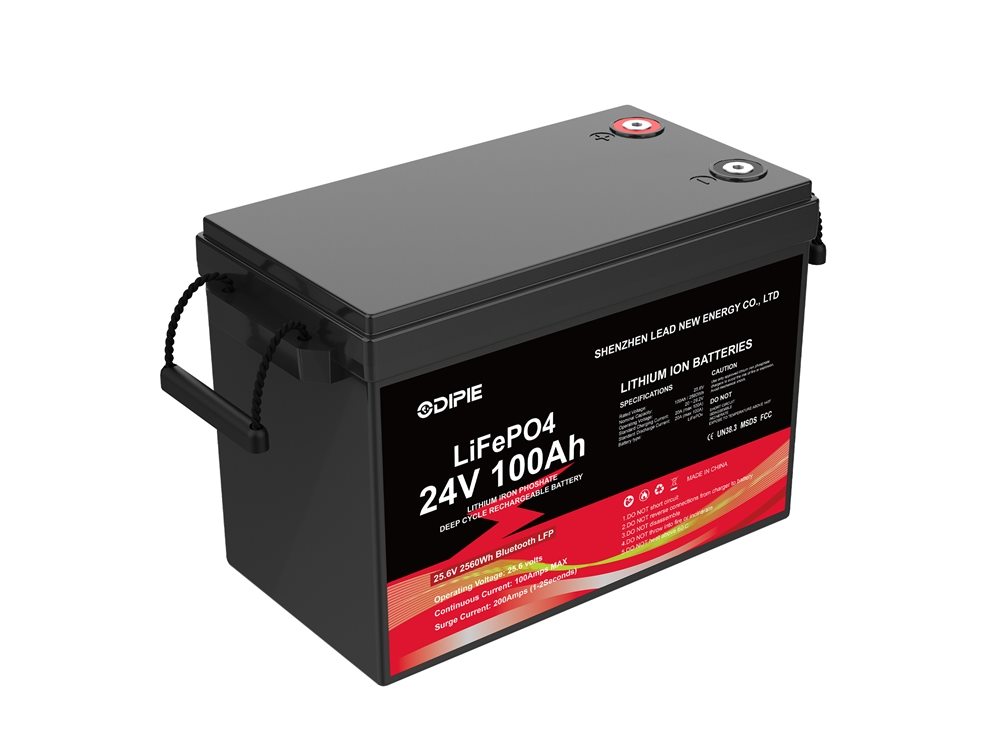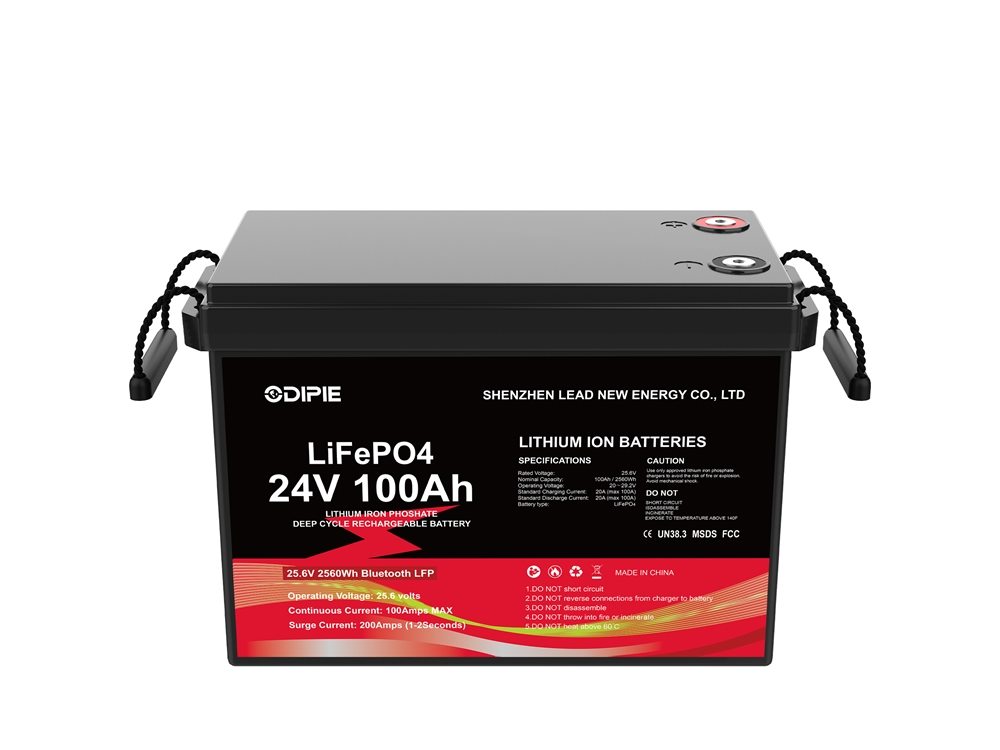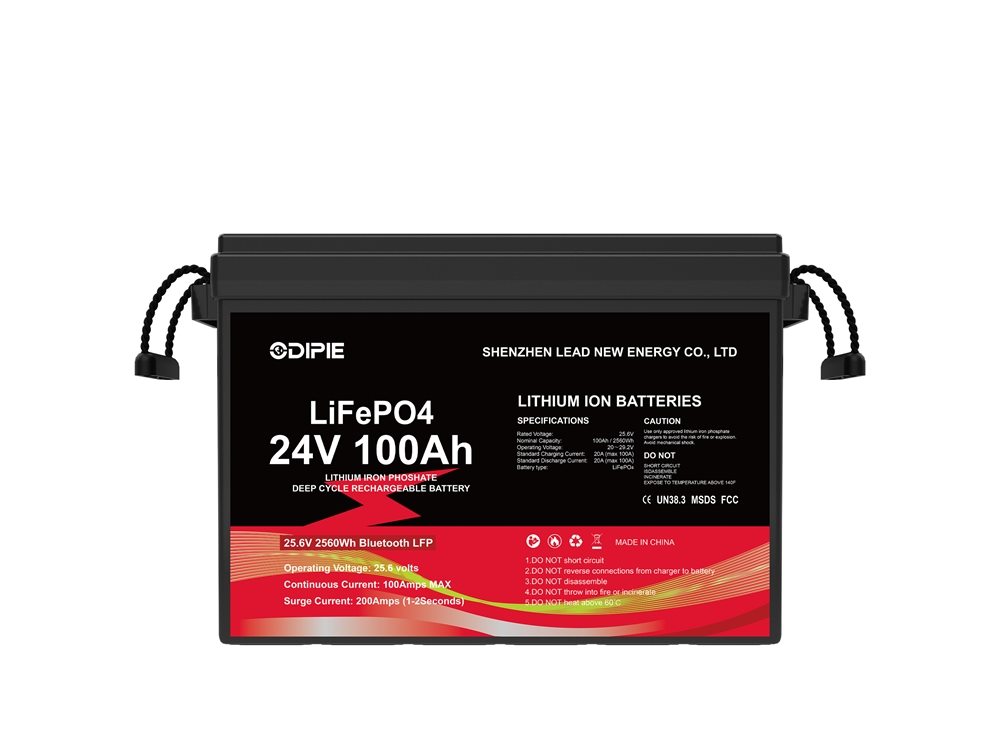 Odipie 25.6 V 100 Ah Safe and Stable LiFePO4 battery offers 2.56 kWh, 5 000+ cycles, 48 lb IP65 case, parallel up to 8 for 24 V solar, telecom. Grade-A cells, 100 A BMS, -20 °C start, 3 h fast charge.